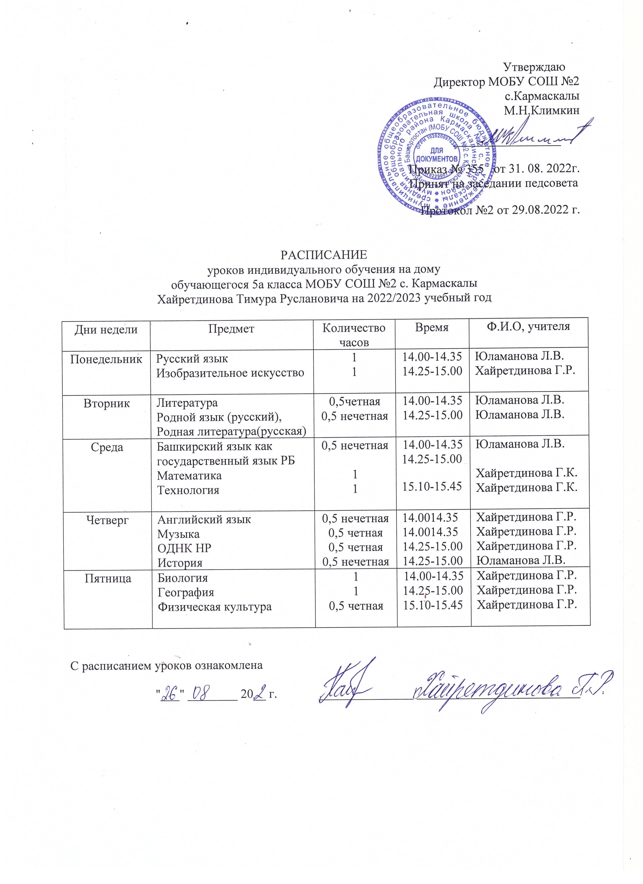 Расписание уроков индивидуального обучения на дому обучающегося 5а класса